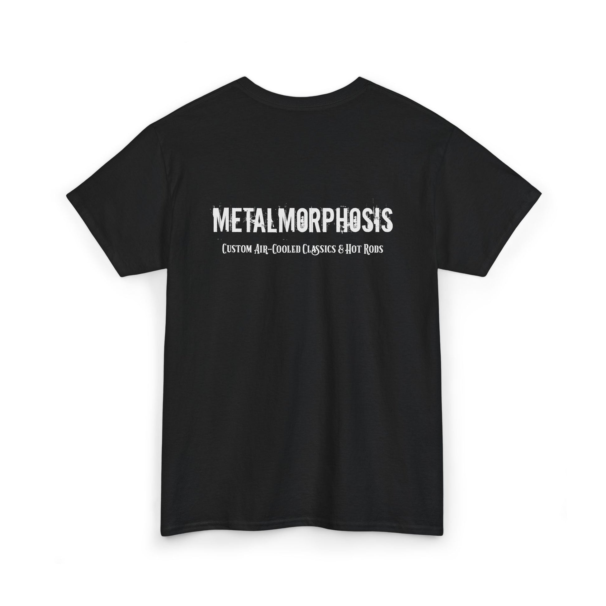 • Iconic Design: The front of the t-shirt features a detailed illustration of The Green Ghia, the full-custom Karmann Ghia build, set against a bold graphic backdrop. The back features the clean MetalMorphosis Customs logo for a polished, finished look.
